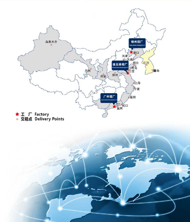 在中远海运的内、外贸航线的支持下,连云港箱厂具备了在国内和日、韩等主要沿海港口交箱的能力;连云港是举世闻名的新亚欧大陆桥东端起点,沿线的西安、兰州和乌鲁木齐等内陆城市也在我司的交箱范围之中;我们的交箱点将给予客户最大的存箱和调箱灵活度。